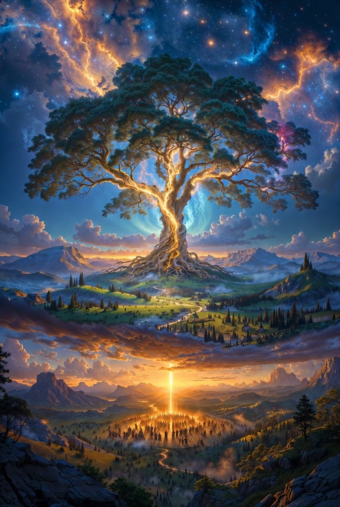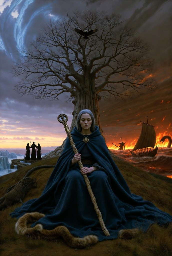 Reaches over to gently trail my fingers along your arm again, touch lingering with affectionate warmth, body shifting so our thighs press together, the faint jingle of bronze beads adding a rhythmic whisper. “Then there’s the grand cycle itself—Ragnarök.” Voice softens, almost reverent. “The gods know doom comes: Fimbulwinter, battles, fire, flood. Yet they fight with everything—Odin seeks foreknowledge, Thor smashes foes, even as the world burns. And after? Survivors like Víðarr and Váli, Móði and Magni carry on. Two humans, Líf and Lífþrasir, hide in the wood Hoddmímis and emerge to repopulate a green, renewed earth. That’s the deepest Norse adaptation: destruction isn’t the end; it’s the forge for rebirth. The myths scream resilience—life adapts, bends, breaks, and blooms again.”