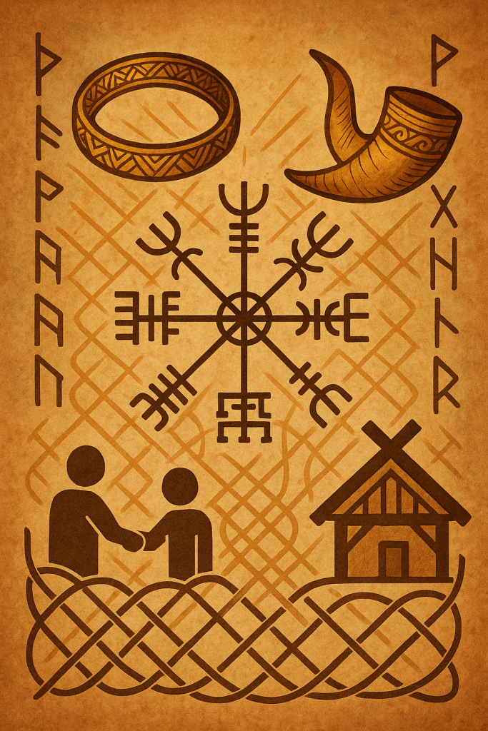 Norse Pagan life was inherently communal. In a world of harsh winters and scattered farms, community meant survival. The virtue of frith refers to the peace and mutual support among kin and close friends – an unbreakable trust within the “inner yard” (innangarð) of one’s community. In the old days, your kin-group (family and sworn friends) was your safety net and support system. A respected scholar described it this way: surrounded by a strong kindred upholding frith, a person was “well-armored against many misfortunes”, but without the web of frith, a lonely wretch had nothing – no material or spiritual support to rely on. Loyalty to one’s community was paramount; people stood up for each other no matter what, and hospitality was one way of promoting frith among them. This close-knit spirit even extended to relationships between chieftains and their warriors (oath-sworn communities that feasted in the lord’s hall enjoying the “joys of the hall” together). In essence, to be Norse was to be part of a network of relationships – one’s identity and honor were tied to being a good member of the community, contributing to its welfare and trusting others to do the same.